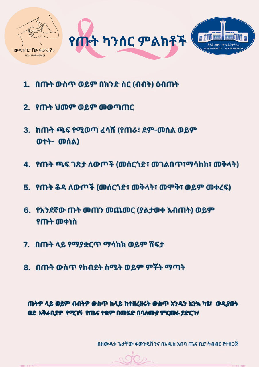 Zewditu Getachew Foundation (ZGF) is an Ethiopian organization dedicated to improving awareness of breast cancer, fostering early detection, and supporting access to quality-proven treatment to those affected by breast cancer.